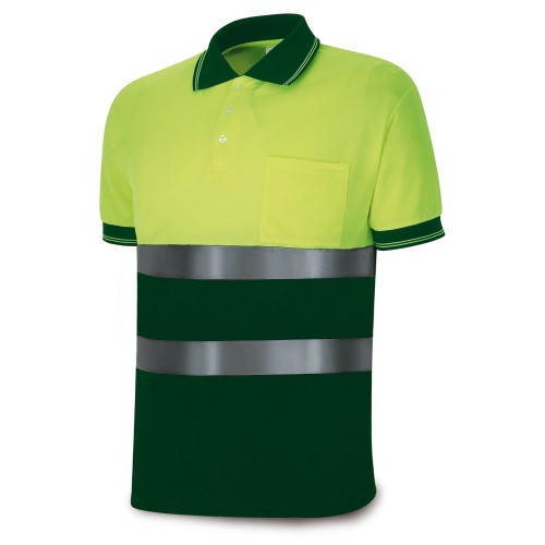 Polo fluorescente combinados de alta visibilidad de manga corta. Tejido de poliéster de alta visibilidad “birdeye” de 150 gr/m2 que asegura ventilación entre las fibras y evaporación del sudor.Composición: 100% poliéster. Alta visibilidad. Máx. X25.Masa laminar total: 150 gr/m2