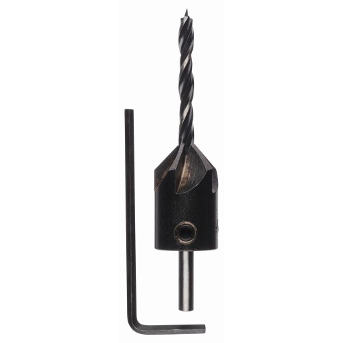 Perforación y avellanado en un solo paso - La broca en espiral para madera con avellanador perfora, avellana y desbarba eficazmente madera en un solo paso. Se monta sobre una broca en espiral para madera y permite realizar las tres operaciones de una sola vez. El avellanador es adecuado para utilizar en madera blanda y dura, conglomerado laminado y no laminado y contrachapado. Está destinada a la utilización con taladros portátiles o de mesa. Esta broca multifunción, hecha de acero, tiene un ángulo de avellanado de 90 grados, cinco aristas de corte y, además, se puede utilizar como tope de profundidad. El avellanador se suministra con una llave de varilla hexagonal, una broca en espiral para madera y un avellanador insertable. Vástago cilíndrico compatible con portabrocas de tres mordazas