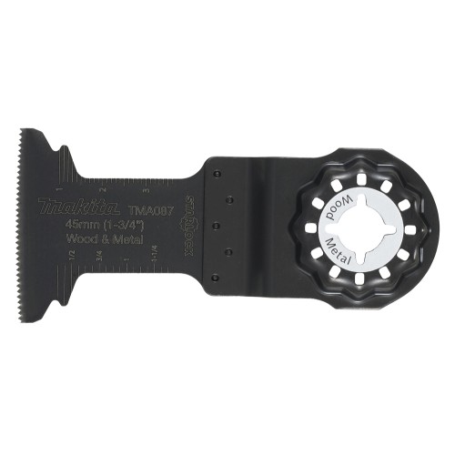 Hoja bimetálica STARLOCK para herramienta multifunción, indicada para cortar aluminio, madera, epoxi y placas de yeso. Dimensiones: 45 mm de ancho, 45 mm de longitud de trabajo, 20 TPI. Suministrada en paquetes de 1 unidad.