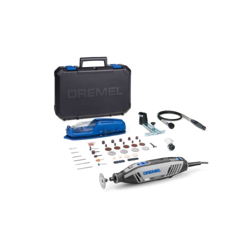 - La máxima potencia para tus proyectos más pesados. Realiza las tareas más complejas y precisas con el completo kit 4250, que incluye 45 accesorios, 3 complementos y dos soluciones de almacenamiento. Transporta la multiherramienta Dremel® 4250 en su ligero maletín o cuélgala de la pared con el soporte para herramientas para tenerla a mano.