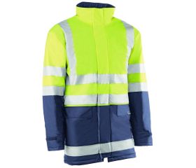 Chaqueta cortavientos (softshell) de alta visibilidad con mangas desmontables en azul marino y amarillo flúor.